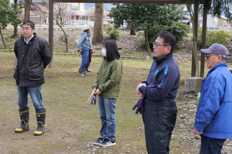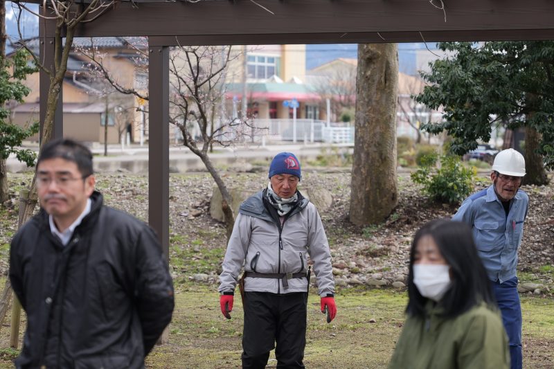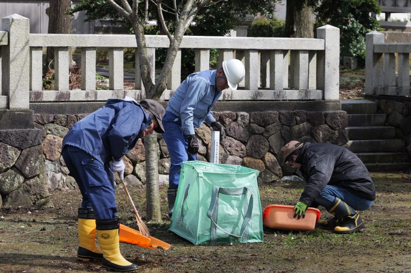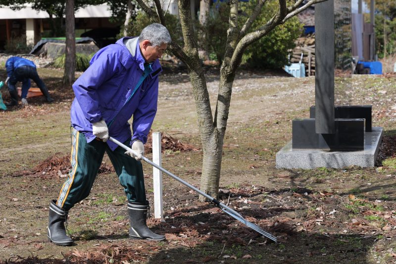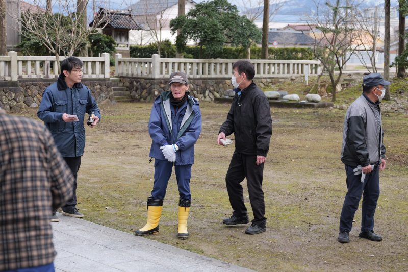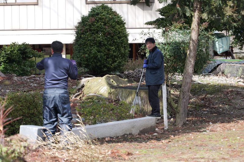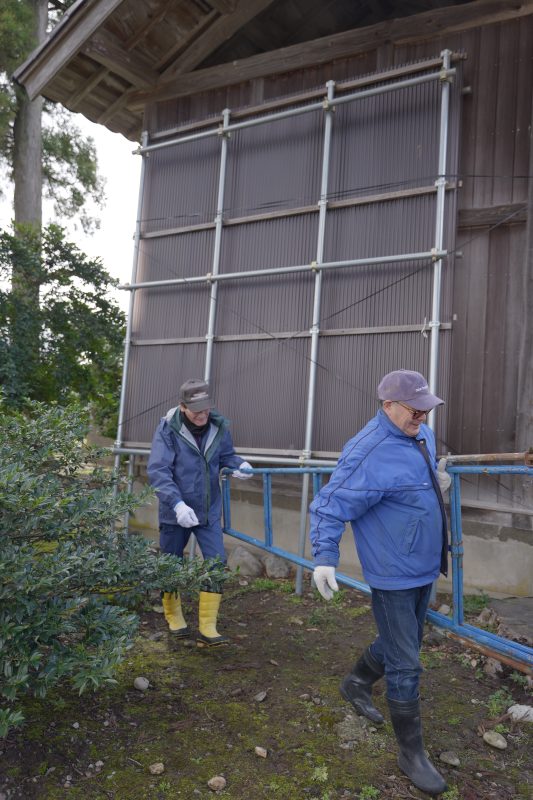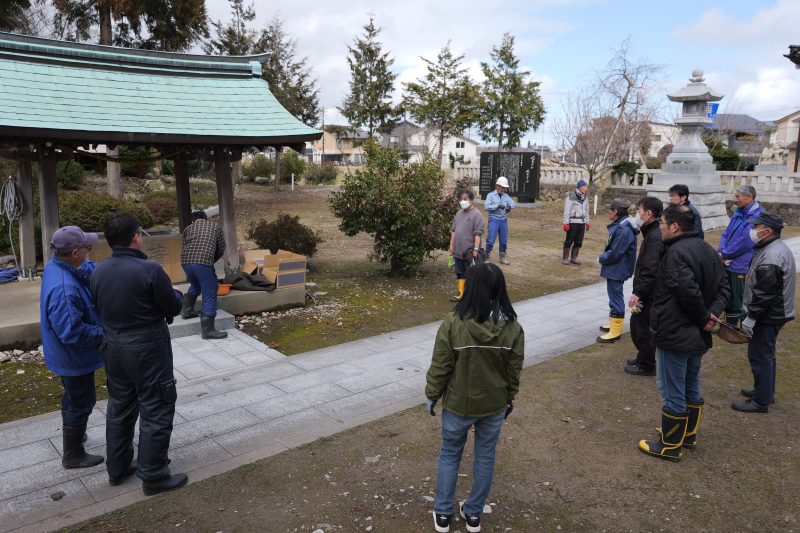 各常会から2名の当番の方々にご協力いただき、拝殿前の雪囲いの撤去と境内の落葉集めを実施しました。